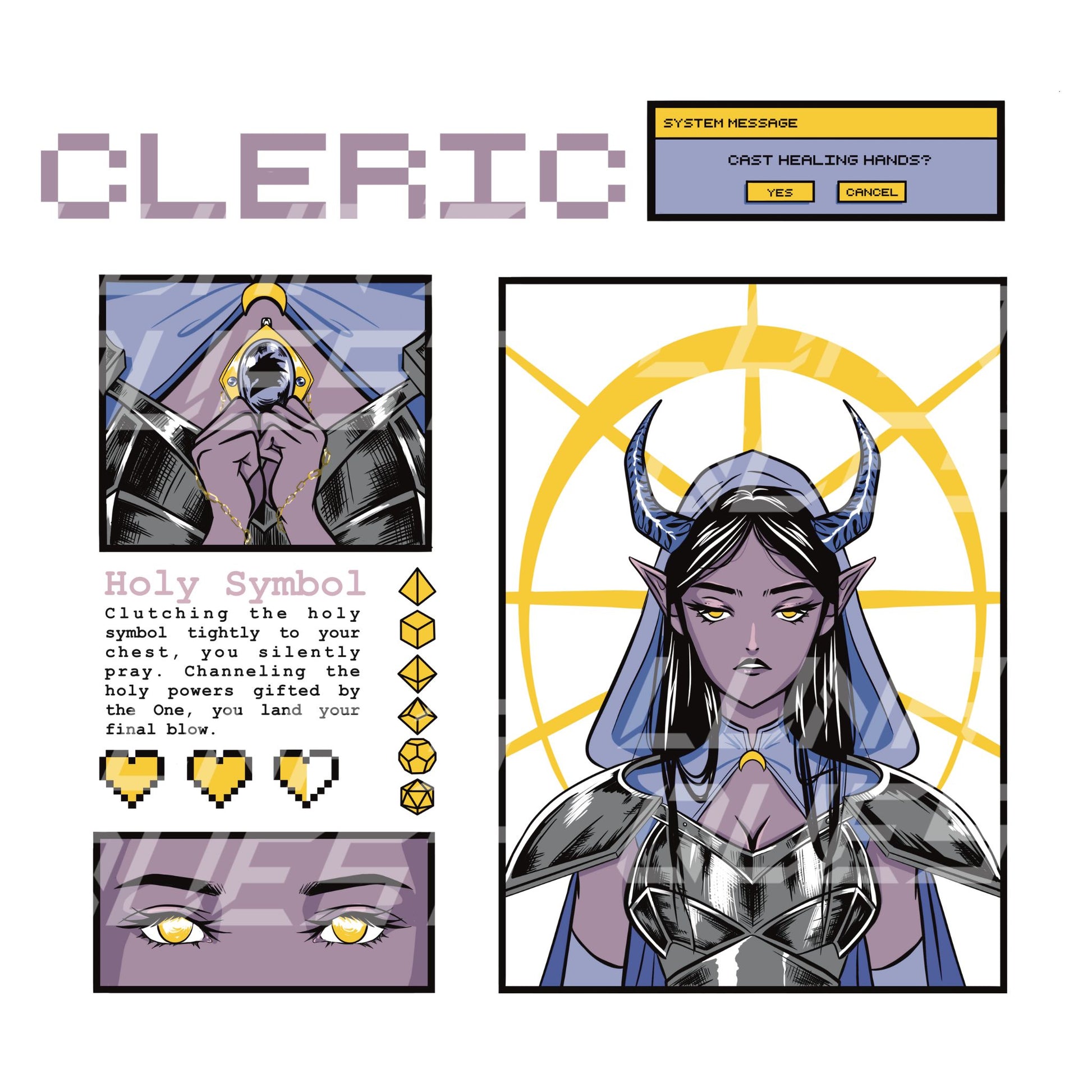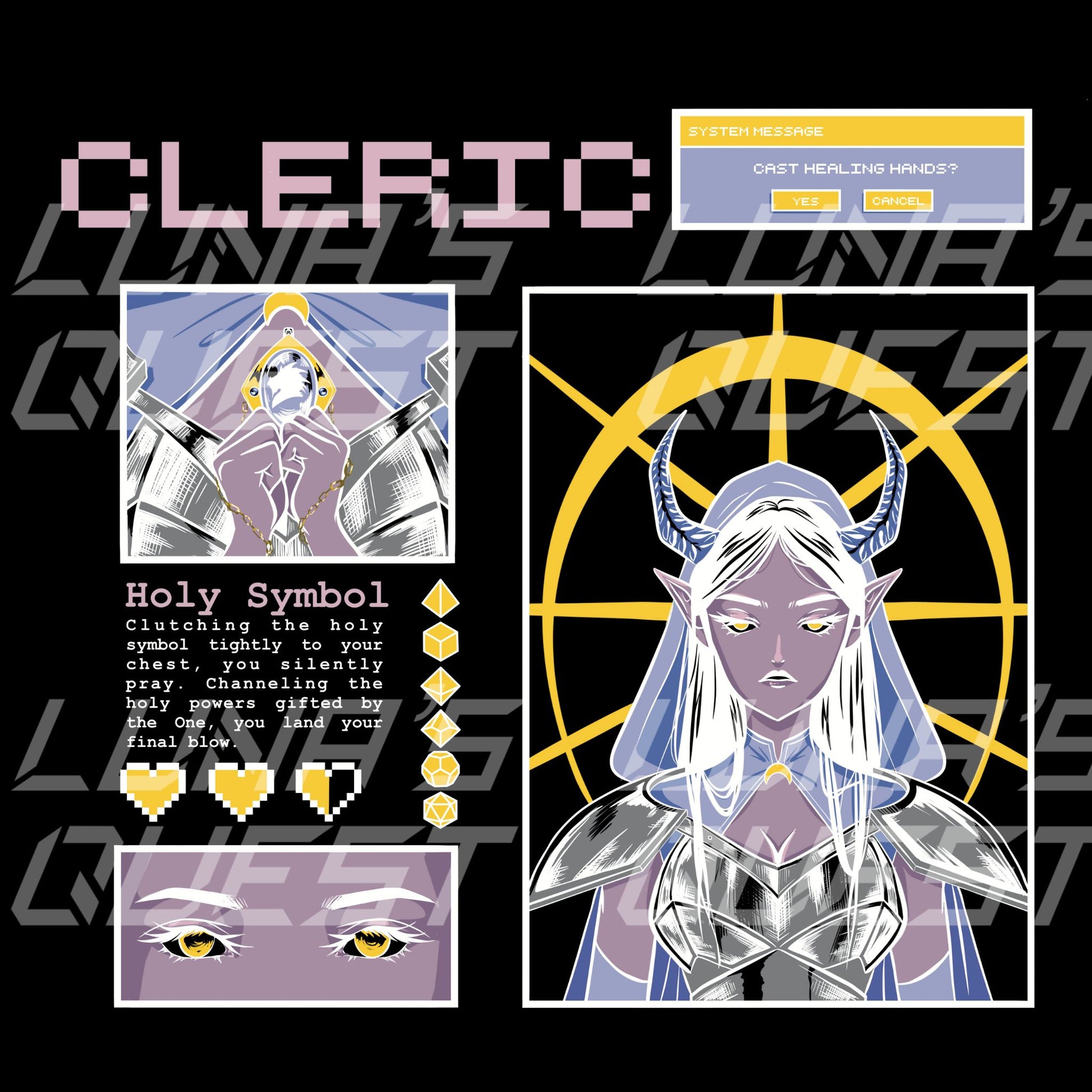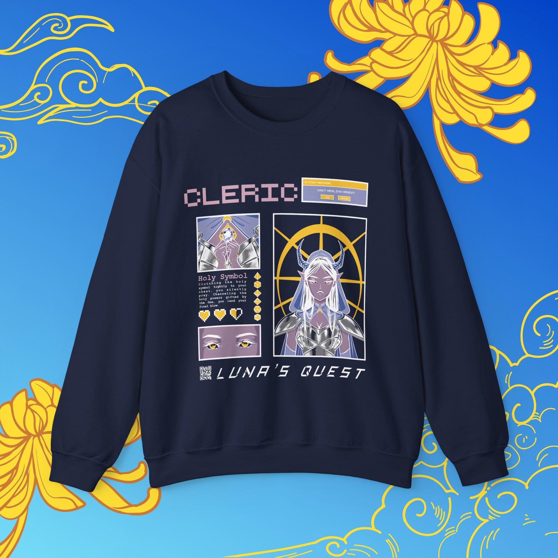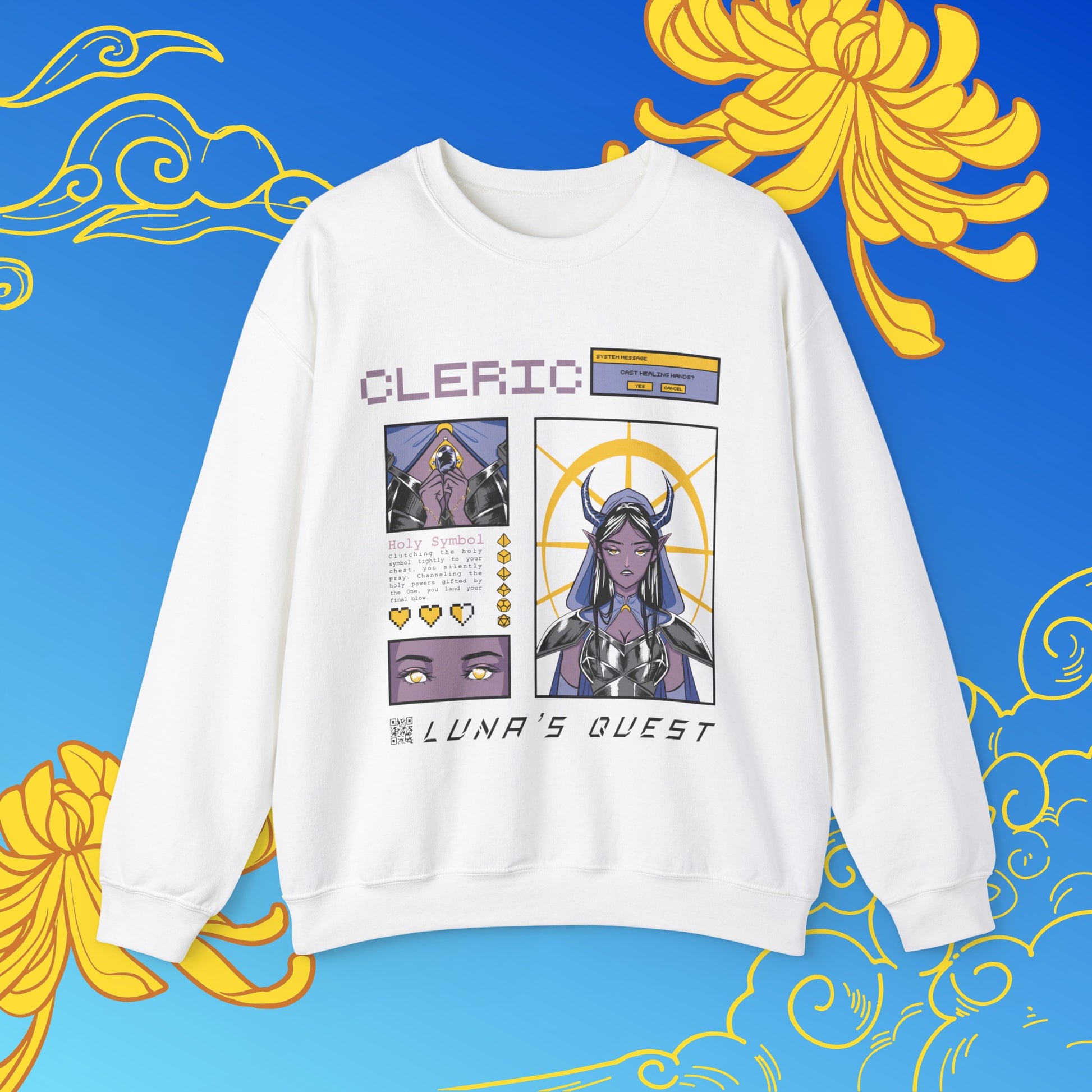 Answer the call of the divine with the Cleric class, a stalwart champion of light and justice. This anime-inspired Dungeons & Dragons sweatshirt blends sacred iconography with ethereal beauty, featuring a resolute cleric grasping her radiant holy symbol, channeling celestial energy against a backdrop of luminous auras and divine light. Whether you follow the path of healing, war, or knowledge, this design embodies the unwavering faith and mystical power of a true cleric.
